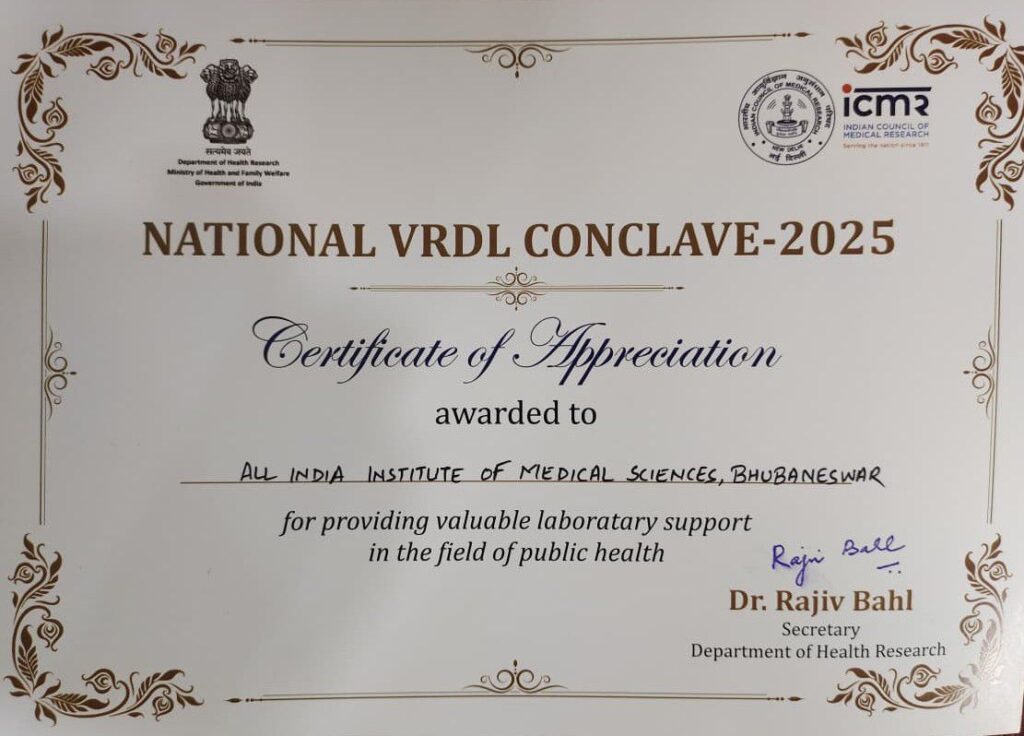 Bhubaneswar : The Viral Research and Diagnostic Laboratory (VRDL) of AIIMS Bhubaneswar has been conferred with the prestigious Silver Award by the Union Ministry of Health & Family Welfare, Government of India, in recognition of its outstanding contributions in diagnostic services, research, and quality in viral diagnostics.